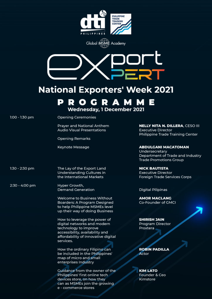 On 1 – 3 December 2021, Philippine Trade Training Center – Global MSME Academy (PTTC-GMEA) will be bringing topnotch #ExportExperts to discuss various trends and issues that the exporting industry currently faces — giving insights on how the industry can still thrive amid challenges.