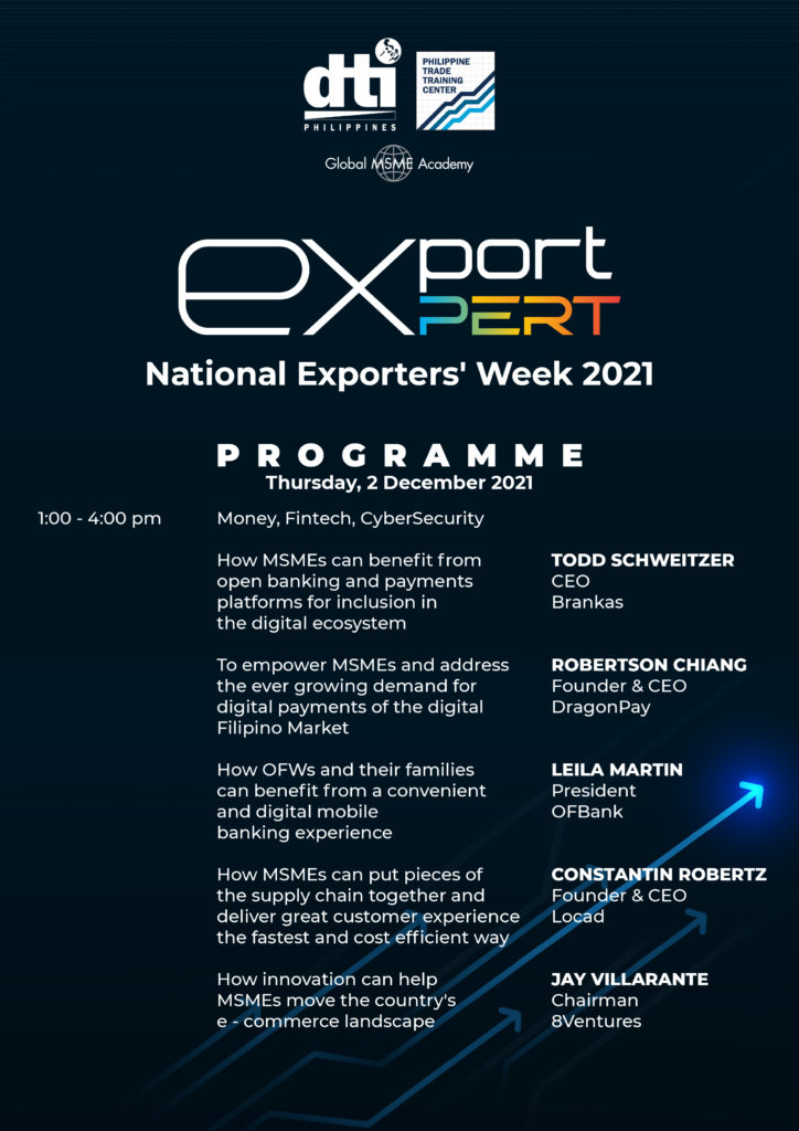 The Philippine Trade Training Center – Global MSME Academy joins the exporting industry in celebrating the #NationalExportersWeek2021 with the theme “ARISE (Accelerate Rebuilding, Innovation, Support and Empowerment) of Philippine Exporters.”