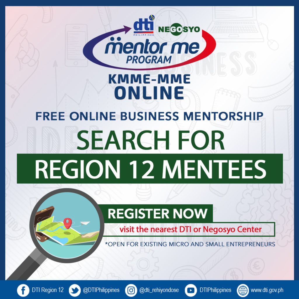 KORONADAL CITY, – The Department of Trade and Industry Region 12 (DTI-Region 12) is in search of budding entrepreneurs in Region 12 who will undergo free mentoring and coaching from DTI’s pool of expert business owners and practitioners for the 2021 Kapatid Mentor ME-Money Market Encounter Online (KMME-MME) Program.