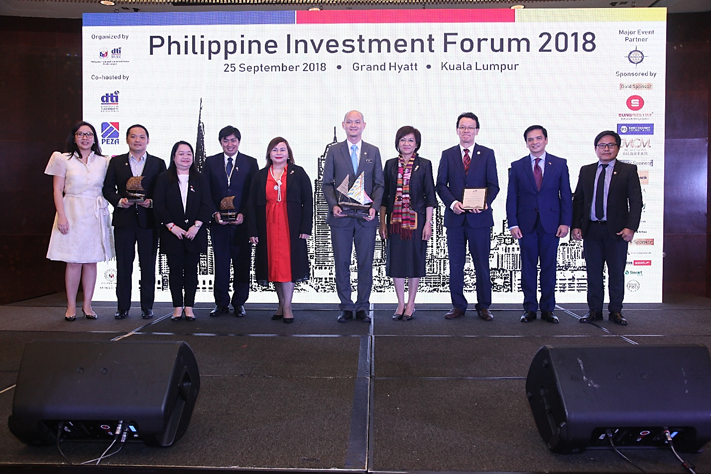 Philippine Investment Forum 2018 (25 September 2018, Kuala Lumpur): Guest of Honor and Speakers during the Awarding of Token of Appreciation and Photo Opportunity. From left to right: Katrina Banzon, Commercial Attaché of the Philippine Trade and Investment Center – Kuala Lumpur (organizer); Danny Leong, Group CEO of GHL Systems Berhad; Aileen Zosa, Executive Vice President of the Bases Conversion and Development Authority (BCDA); Patrick Nicholas David, President of AlloyMTD (Philippines) Holding Co., Inc.; Charito B. Plaza, Director General of the Philippine Economic Zone Authority (PEZA), YB Dr. Ong Kian Ming, Deputy Minister of Trade and International Industry (MITI); Nora Terrado, Undersecretary for Trade and Promotions Group of the Department of Trade and Industry (DTI); Edward Ling, President of the Malaysia Chamber of Commerce and Industries Philippines, Inc. (MCCI); H.E. Charles Jose, Ambassador of the Embassy of the Republic of the Philippines in Kuala Lumpur; and Romeo Montenegro, Assistant Secretary of the Mindanao Development Authority (MinDA). Not in photo: Secretary Datu Abul Hj. Khayr D. Alonto, Chairman of MinDA; Atty. Zuleika Lopez, City Administrator of the City Government of Davao; Lemuel Ortonio, Head of the Davao City Investment Promotion Council (DCIPC); and Dr. Myl Johann Amsid, Consultant of the Zamboanga City Special Economic Zone Authority (ZCSEZA). |