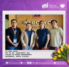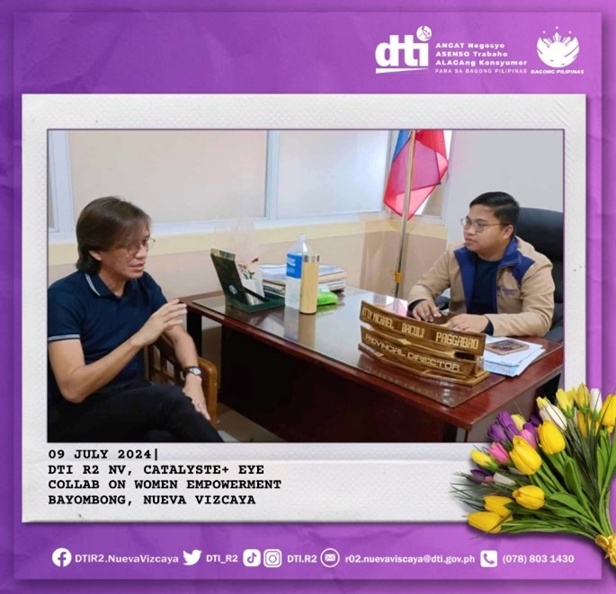 As part of the significant steps towards fostering MSME development and women empowerment, DTI R2 Nueva Vizcaya Provincial Director Atty. Michael B. Paggabao met with Project Officer Vener Valerio of Catalyste+ (formerly known as Canadian Executive Service Organization), as the latter conducted a courtesy visit on 09 July 2024.