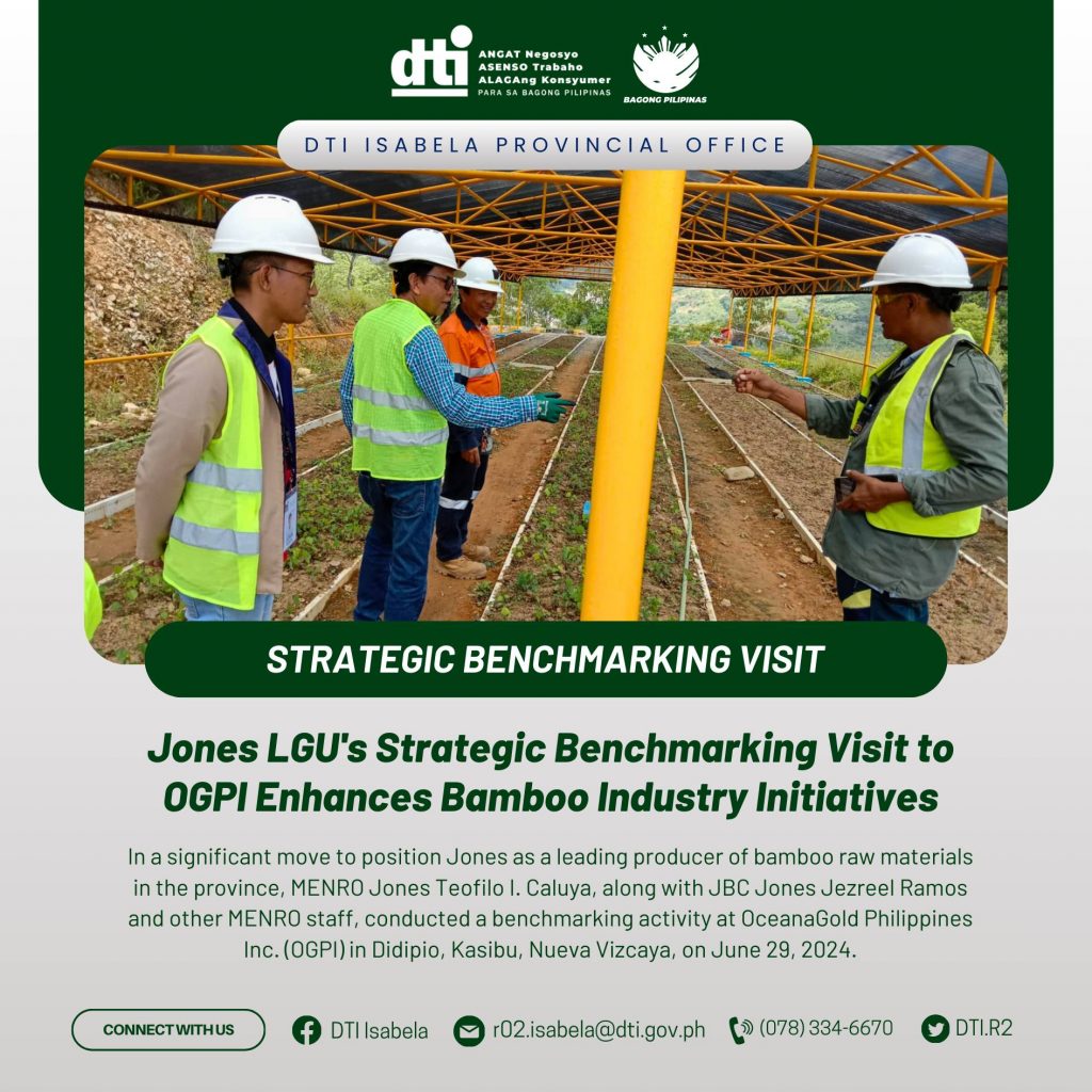 Kasibu, Nueva Vizcaya—  In a significant move to position Jones as a leading producer of bamboo raw materials in the province, MENRO Jones Teofilo I. Caluya, along with JBC Jones Jezreel Ramos and other MENRO staff, conducted a benchmarking activity at OceanaGold Philippines Inc. (OGPI) in Didipio, Kasibu, Nueva Vizcaya, on June 29, 2024. This visit underscores LGU Jones’ dedication to enhancing the local bamboo industry through the adoption of advanced technology and best practices in bamboo propagation and nursery management.