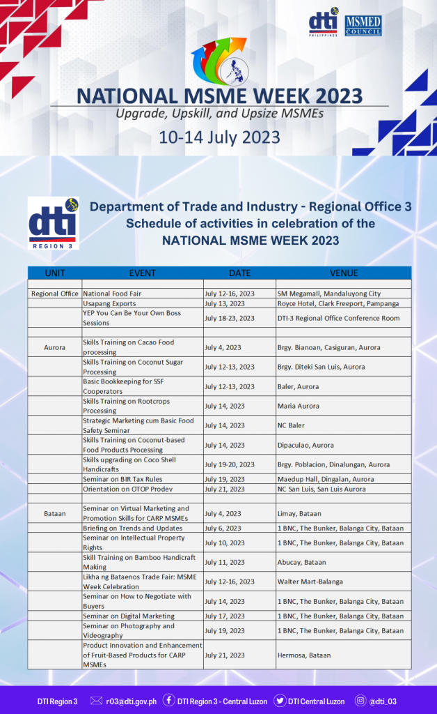 DTI-3 joins the Bureau of Small, Medium Enterprise Development (BSMED) in leading the celebration by providing free business capability trainings, workshops, and trade fairs across the region.