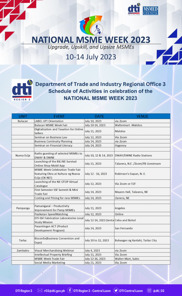 MANDALUYONG CITY — Micro, Small and Medium Enterprises (MSMEs) will be in the limelight as the Department of Trade and Industry Region 3 (DTI-3) celebrates the 2023 MSME Week on July 10-14, 2023 with the theme “Upgrade, Upskill, and Upsize MSMEs”.