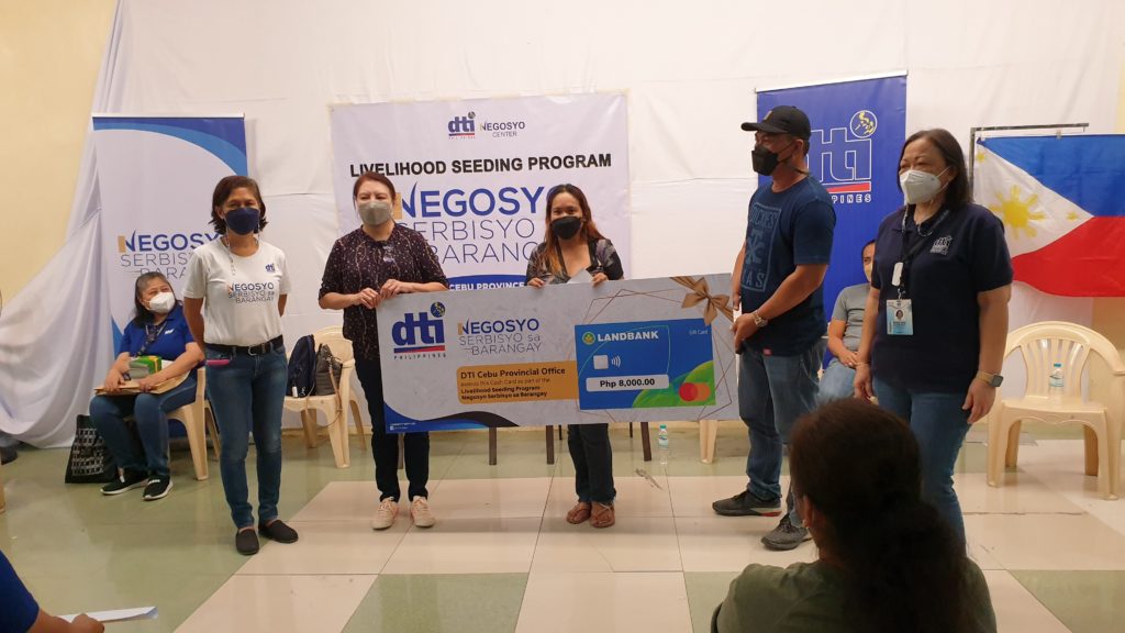 As of 3 January 2021, the Department of Trade and Industry (DTI) in Central Visayas has distributed P3.120-M worth of livelihood kits to 320 eligible micro entrepreneurs from the towns of Sibonga , Carcar, Dalaguete , Argao in Cebu; in the towns of Ubay, Bien Unido, San Miguel, Trinidad, Talibon, Carlos P. Garcia in neighboring Bohol; as well as La Libertad, Guihulngan City in Negros Oriental received P3.120-M worth of negosyo kits. The livelihood kits amounting to P8,000 for each micro-enterpreneur was given via the Landbank Cash Card.