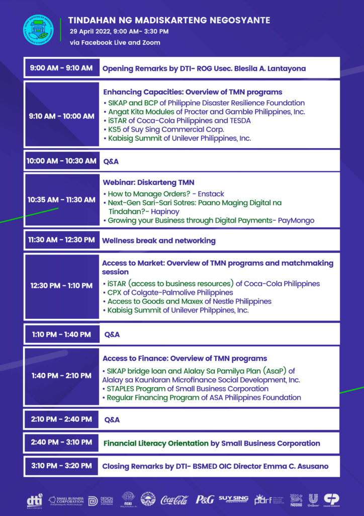 Sa pangunguna ng DTI at iba pang partner government agencies, microfinance institutions, civil society organizations, and business corporations, ang Tatak: Matatag na Negosyo (TMN) Kick-Off Activity na may temang “Tindahan ng Madiskarteng Negosyante” ay naglalayong makatulong sa micro-retailers na magkaroon ng kaalaman sa mga programang nagbibgay pautang, pagpapalawak ng negosyo at kakayahan sa pag-nenegosyo.