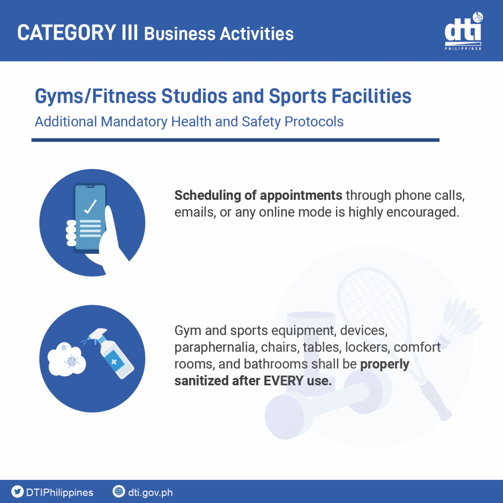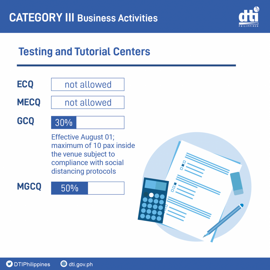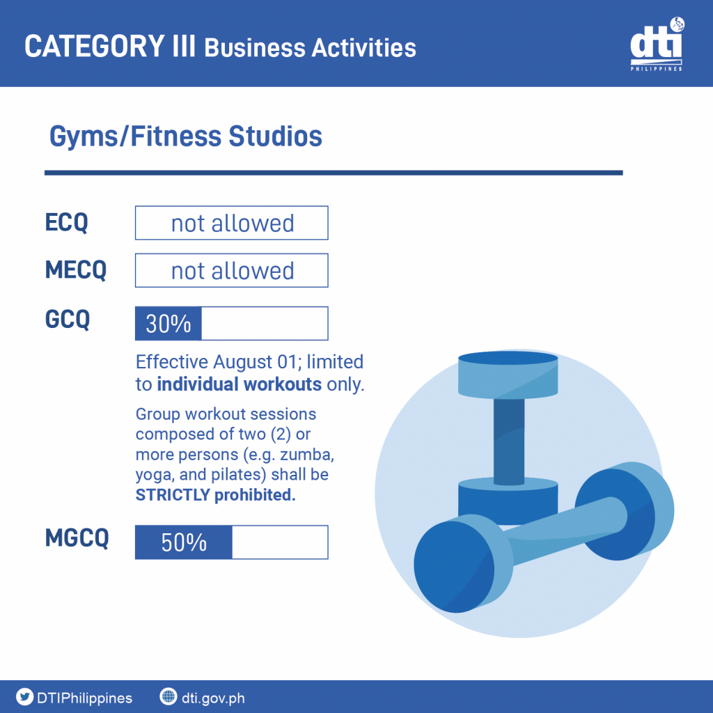 Recategorization of Some Business Establishments or Activities under Category IV to Category III. The following business establishments or activities are recategorized from Category IV to Category III, and thus, are allowed to reopen beginning 01 August 2020 at thirty (30%) percent operation capacity, subject to the mandatory minimum health standards protocols provided under Annex “B” and respective protocols per business establishment and activities: a. testing, tutorial (Annex “C”), and review centers (Annex “D”); b. gyms, fitness centers, and sports facilities but limited to individual workouts only. Group workout sessions composed of two (2) or more persons (e.g. zumba, yoga, pilates, etc.) shall be strictly prohibited; (Annex “E”) c. internet cafes; (Annex “F”) d. dermatological clinics offering aesthetic procedures; (Annex “G”) e. other personal care services (except full-body massage services); (Annex “G”)