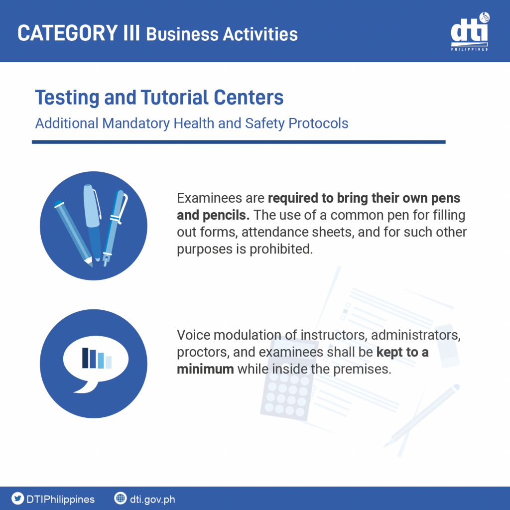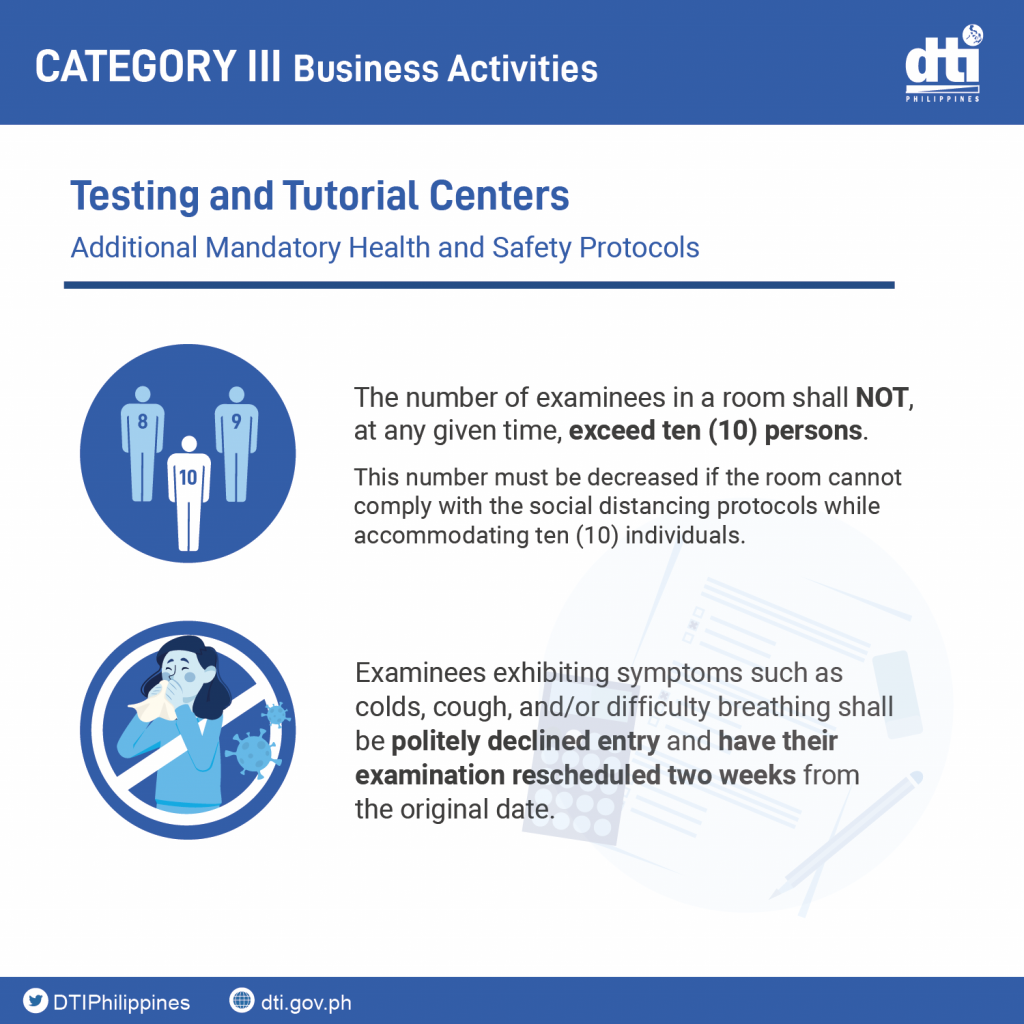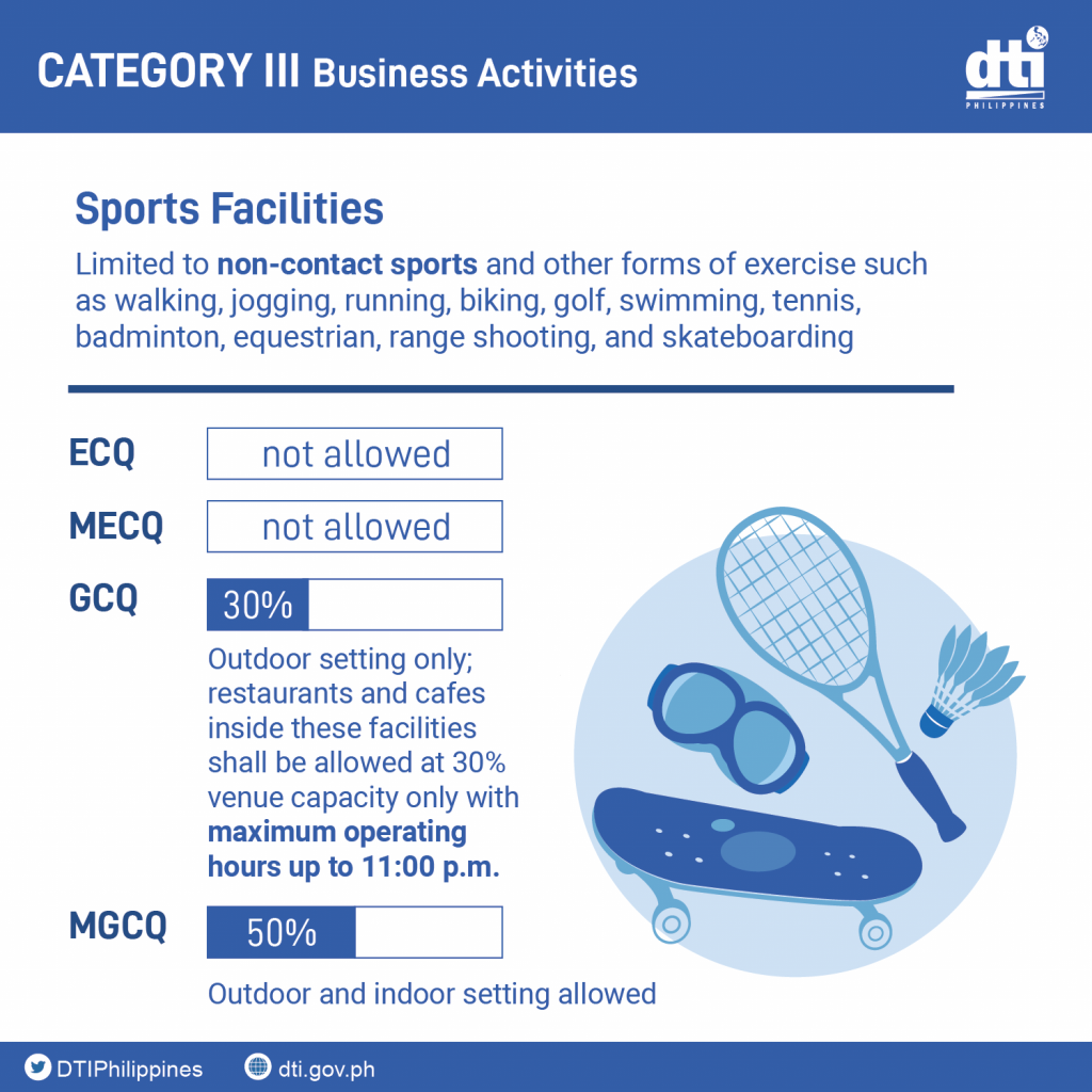 Recategorization of Some Business Establishments or Activities under Category IV to Category III. The following business establishments or activities are recategorized from Category IV to Category III, and thus, are allowed to reopen beginning 01 August 2020 at thirty (30%) percent operation capacity, subject to the mandatory minimum health standards protocols provided under Annex “B” and respective protocols per business establishment and activities: a. testing, tutorial (Annex “C”), and review centers (Annex “D”); b. gyms, fitness centers, and sports facilities but limited to individual workouts only. Group workout sessions composed of two (2) or more persons (e.g. zumba, yoga, pilates, etc.) shall be strictly prohibited; (Annex “E”) c. internet cafes; (Annex “F”) d. dermatological clinics offering aesthetic procedures; (Annex “G”) e. other personal care services (except full-body massage services); (Annex “G”)