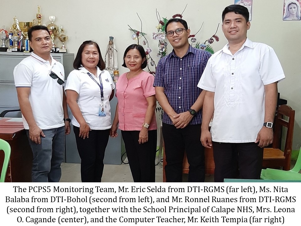 In 2019, the Department of Trade and Industry was granted by the Government of Japan over Php 190 Million in funding for the implementation of the fifth phase of the Personal Computers for Public Schools project (PCPS5). Under PCPS5, a total of 380 public high schools in Visayas and Mindanao received a computer package consisting of ten units of desktop computers pre-installed with the latest Windows and Microsoft Office software and peripherals including ten uninterruptible power supply (UPS) and one 3-in-1 Inkjet printer. As of December 2019, the PCPS5 Monitoring Team, which consists of representatives from DTI-Resource Generation and Management Service (RGMS) and PCPS5 Regional and Provincial Coordinators, has monitored 133 (35%) recipient high schools in all regions of Visayas and Mindanao excluding Region IX to check the status of the computers provided and determine the schools’ compliance to required counterpart facilities (e.g. air-conditioning unit, door and window grills, Internet connectivity, and circuit breakers). The PCPS5 Monitoring Team also interviewed the principals and the computer teachers to assess how the computers are being utilized and maintained. Overall, majority of the computer packages are in good working condition and fully operational, with only a few reports of defective equipment. Likewise, 70% of the recipient schools were able to comply with either most or some of the required counterpart facilities—with air-conditioning unit and internet connectivity as the common lacking among the schools. To maintain the computer laboratories, the schools also allot a portion of their Maintenance and Other Operating Expenses (MOOE) and seek additional funding support from PTA and their LGUs. Since its initial implementation in 2001, the PCPS project has provided more than 60,000 computers to more than 5000 schools nationwide helping increase computer access in public high schools from less than 20% in 2001 to 96% when the PCPS Phase 4 ended in 2014.