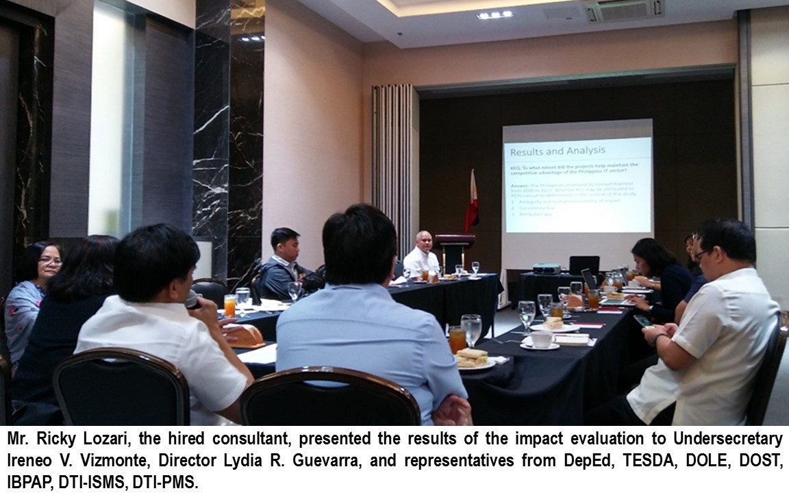 • Conducted a Roundtable Discussion Meeting with former Personal Computers for Public Schools (PCPS) Technical Working Group (TWG) members i.e. Department of Education (DepEd), Department of Information and Communications Technology (DICT), Department of Science and Technology – Advance Science and Technology Institute (DOST ASTI), Department of Science and Technology-Science Education Institute (DOST-SEI), and Department of Trade and Industry- Information Systems Management Service (DTI ISMS)— on 28 July 2017 to discuss the proposed impact assessment of the PCPS project and gather inputs on how to go Sabout it.