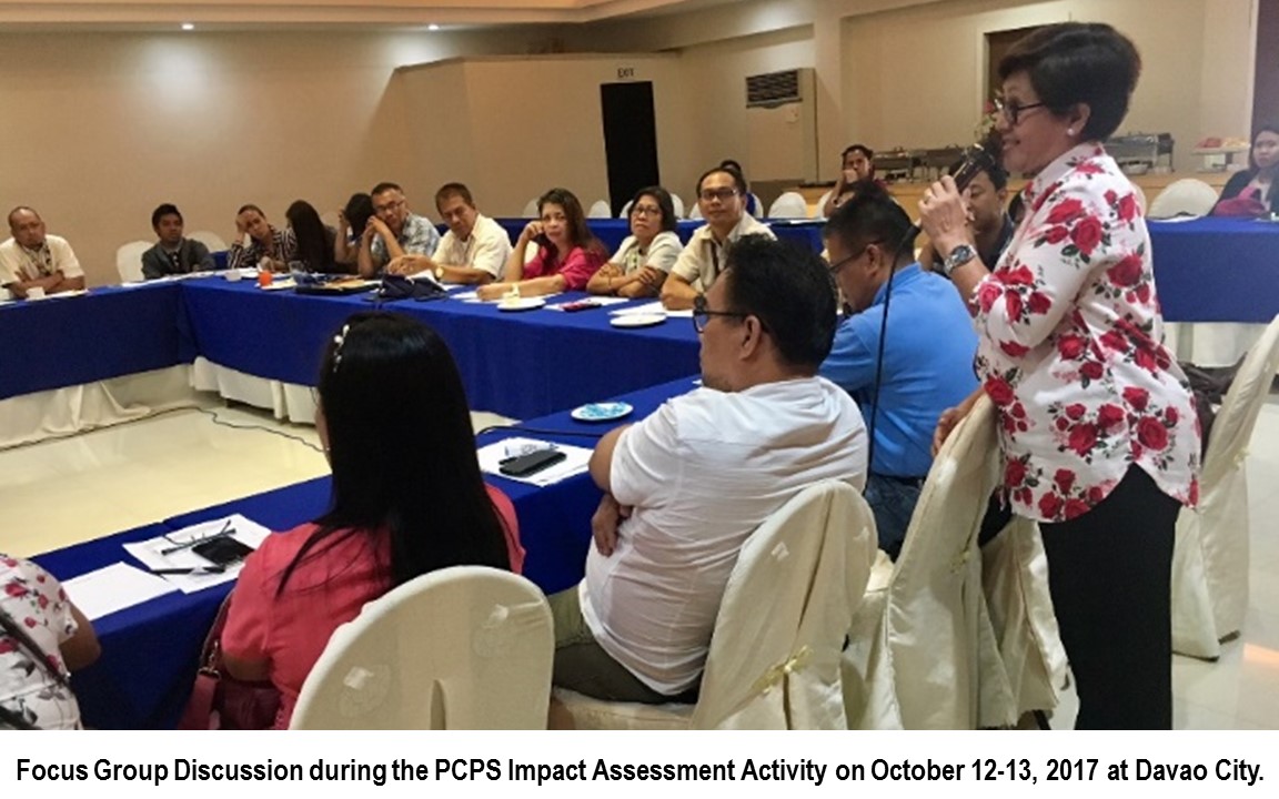• Coordinated and assisted the facilitation of the PCPS Impact Assessment focus group (FGD) with the school beneficiaries of: Region 4A on 7-8 Sep 2017 at Manila; Region 11 on 12-13 October at Davao; and, NCR on 20 October at Makati city—all of which involved public school principals and ICT coordinators. Also documented the sessions.