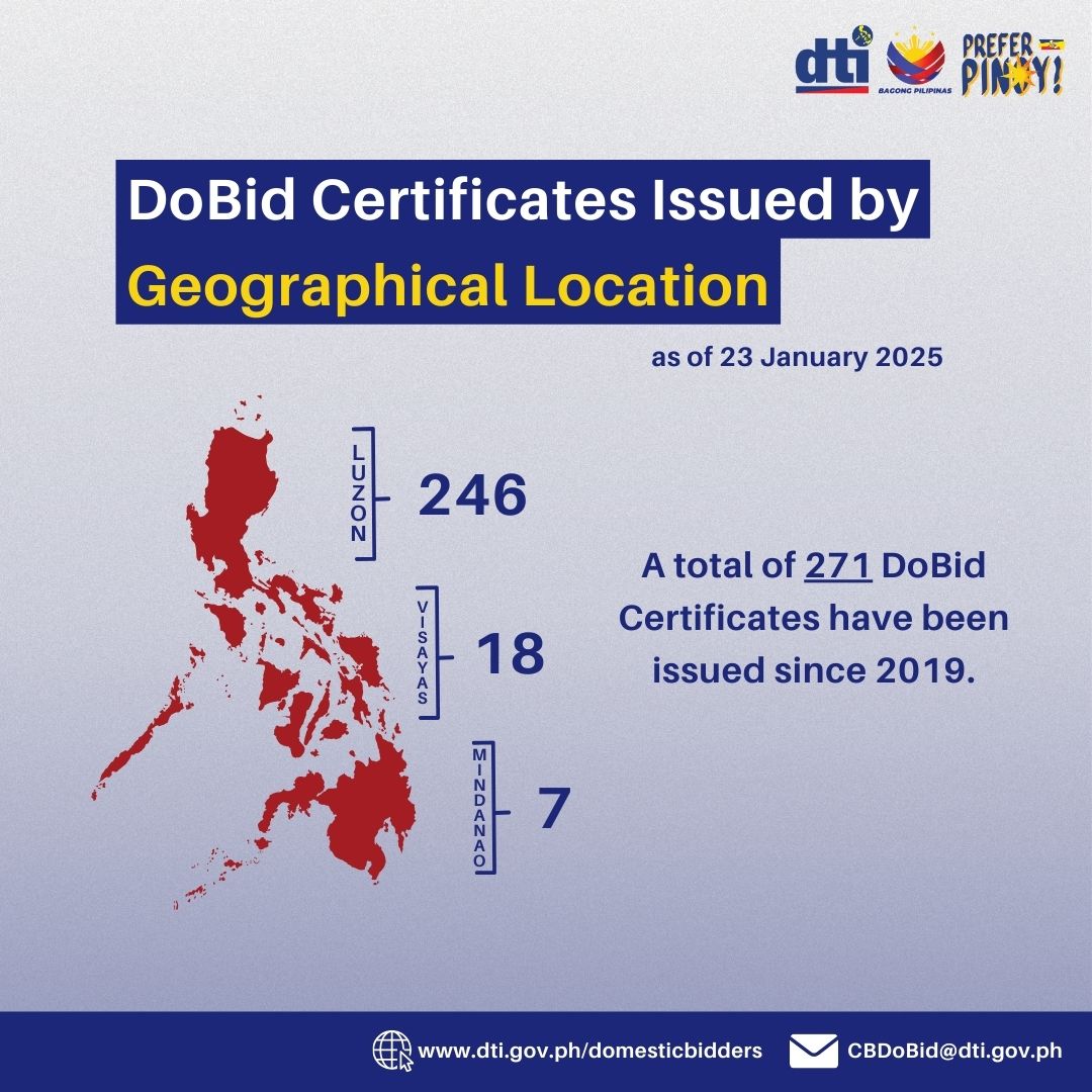 The Department of Trade and Industry - Bureau of Competitive Development (DTI-BCD) recently concluded the Prefer Pinoy Roadshow in October 2024 promoting the Domestic Bidders’ (DoBid) Certificate of Preference Program with a series of information sessions that took place in six key locations—Baguio City, Clark Freeport Zone, Metro Manila, Davao