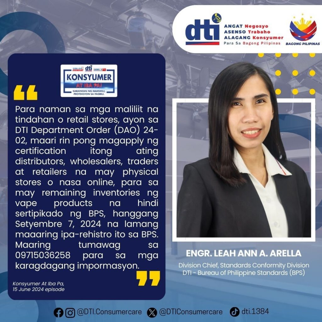 Sa nakaraang Konsyumer At Iba Pa episode, binigyang atensyon natin ang Vape Product Registration sa DTI-BPS, ang konsepto ng Accreditation kasama ang DTI-PAB, at ang mga karapatan at responsibilidad ng konsyumer para sa mas protektadong pamimili.