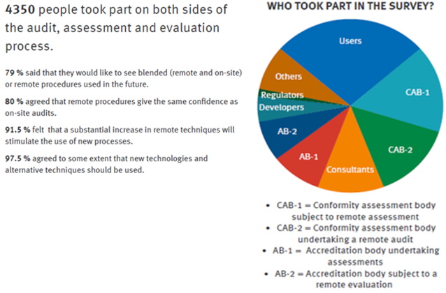 A joint survey by International Accreditation Forum (IAF), International Laboratory Accreditation Cooperation (ILAC) and International Organization for Standardization (ISO) concluded in August 2021 looked at views on the benefits of using remote activities during the pandemic.