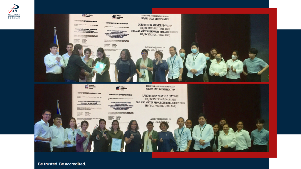 The Department of Trade and Industry – Philippine Accreditation Bureau (DTI-PAB) formally awarded the Certificate of Accreditation to ISO/IEC 17025:2017, in the field of Chemical Testing, to the Department of Agriculture – Bureau of Soils and  Water Management – Soil and Water Resources Research Division (DA-BSWM-SWRRD) on 05 June 2023