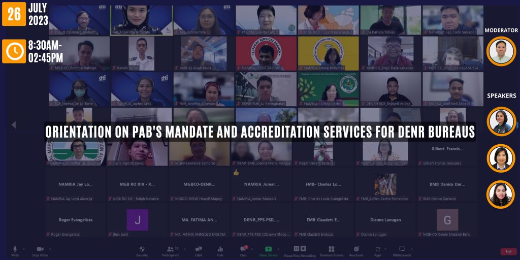 On July 26, 2023, the Department of Trade and Industry's Philippine Accreditation Bureau (DTI-PAB) conducted a virtual briefing via Zoom for the personnel of the Department of Environment and Natural Resources (DENR). The session was attended by 54 personnel representing different Bureaus of DENR, marking a collaborative effort to enhance