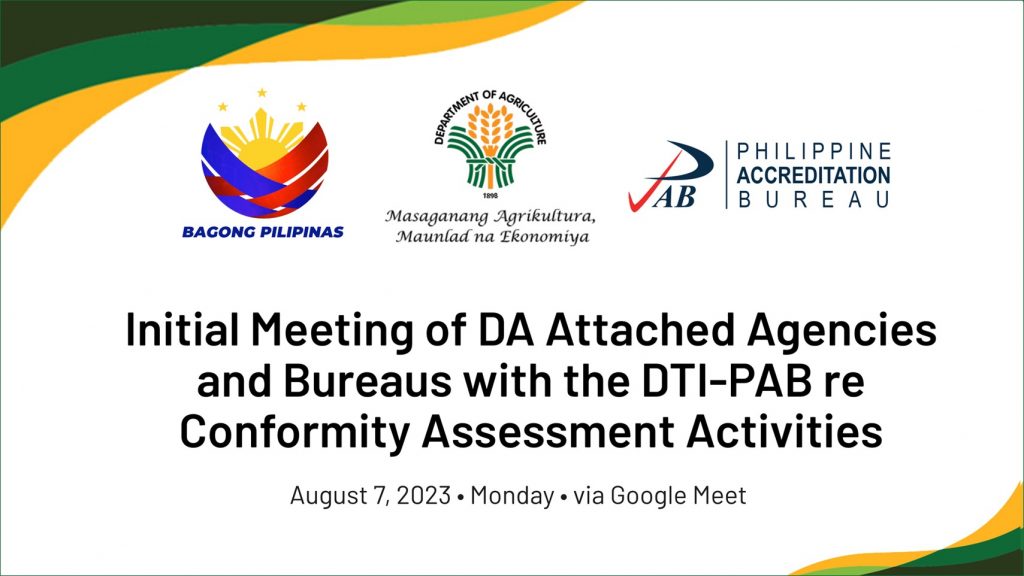On August 7, 2023, the Department of Trade and Industry - Philippine Accreditation Bureau (DTI-PAB) and the Department of Agriculture (DA), through the Office of Dr. Mercedita A. Sombilla, Undersecretary for Policy, Planning, and Regulations, met with various offices and bureaus of DA. The primary objective of the meeting was